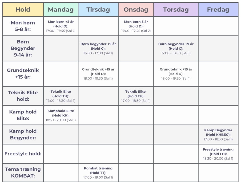 Vi har holdtræning mandag til fredag samt nogle event træninger i weekenden.